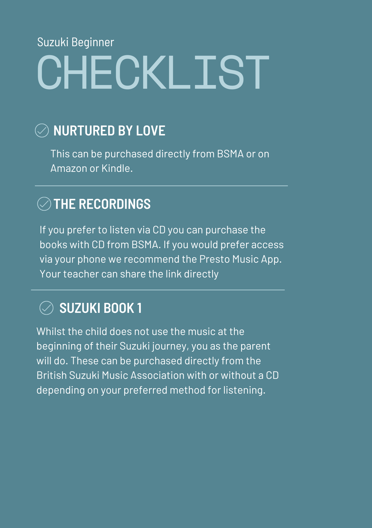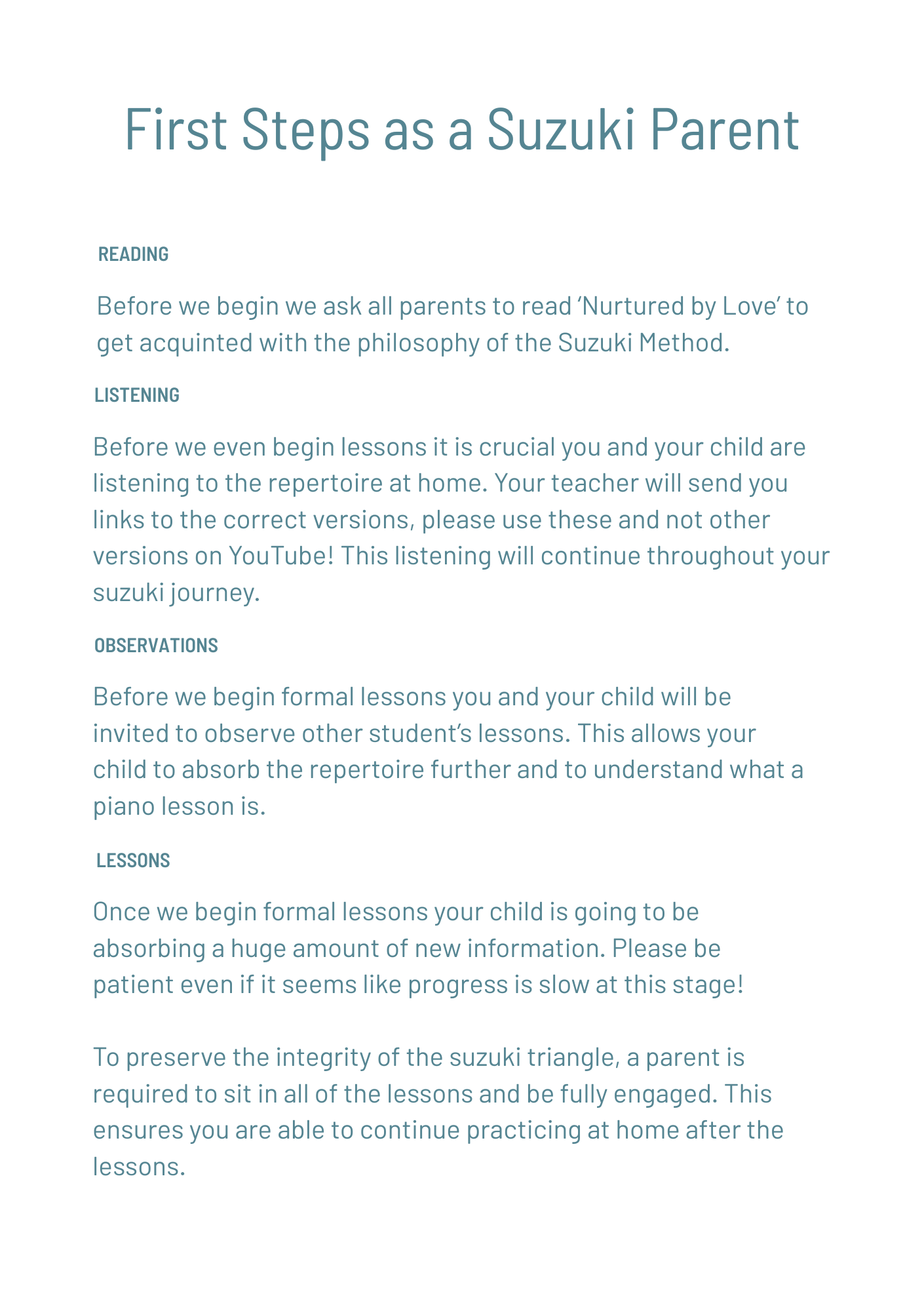 New Parent Information for Suzuki Parents Required ResourcesSuzuki Piano School Volume 1Suzuki Piano School RecordingsNurtured by Love